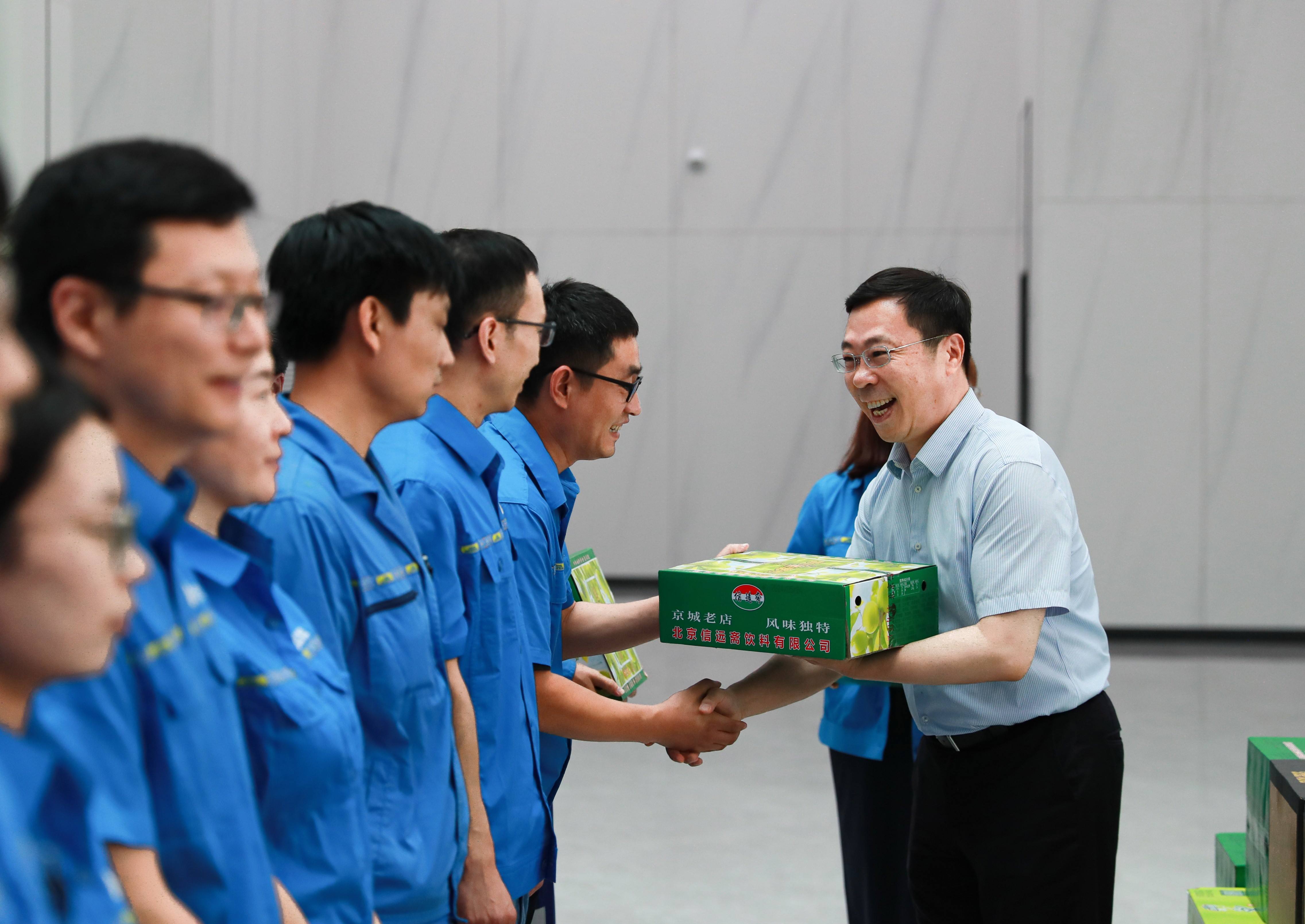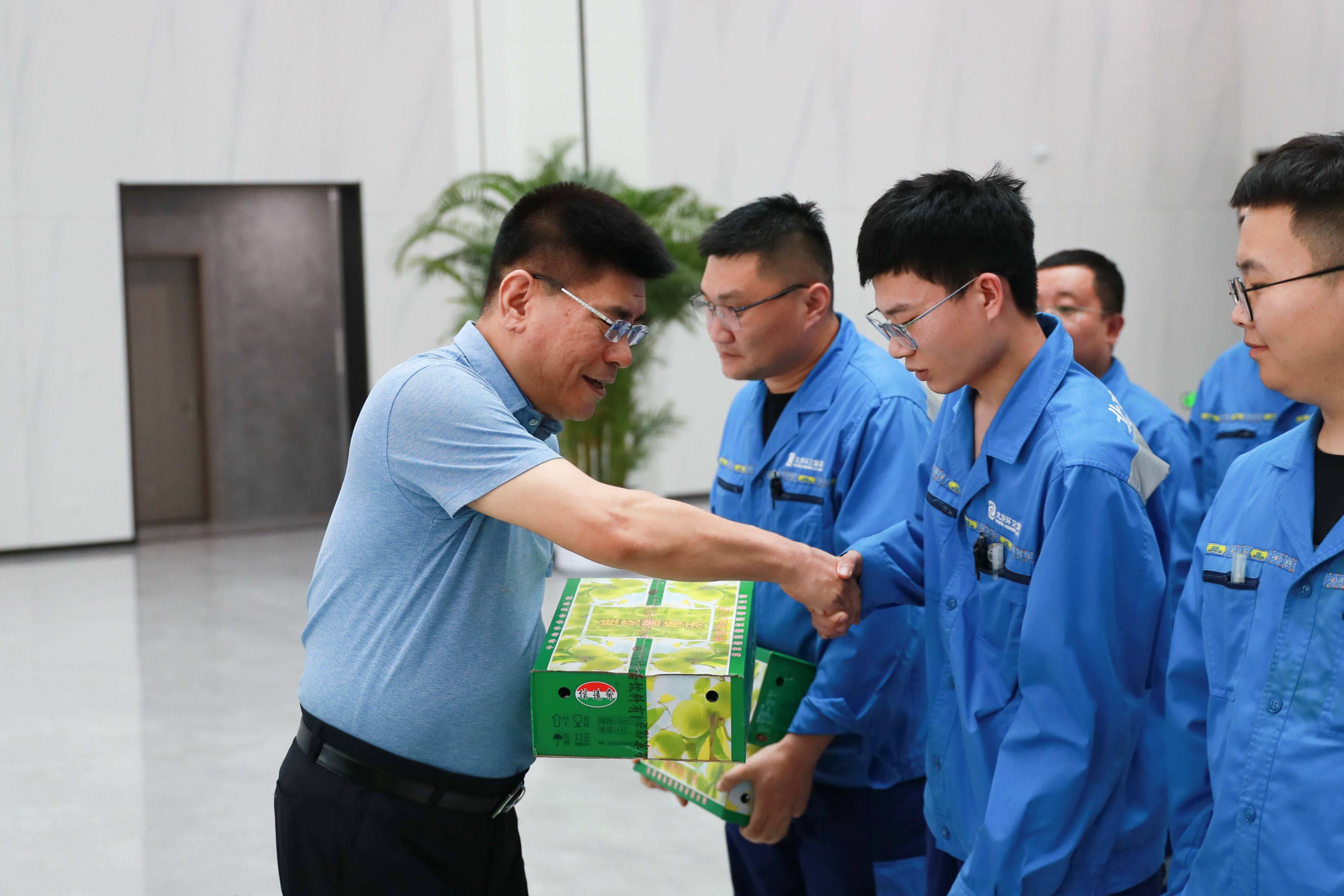 金善文同志向在夏日高温情况下坚守在岗位一线的广大环卫职工致以诚挚的问候。他表示,安定循环经济园区环境干净整洁,非常现代化。这座大型环卫设施的建设和投运离不开广大金年汇人的辛勤付出,大家辛苦了。金善文同志向现场的环卫职工代表送上饮料、矿泉水等防暑降温物品,叮嘱大家提高自我防护意识,做好劳动保护工作。