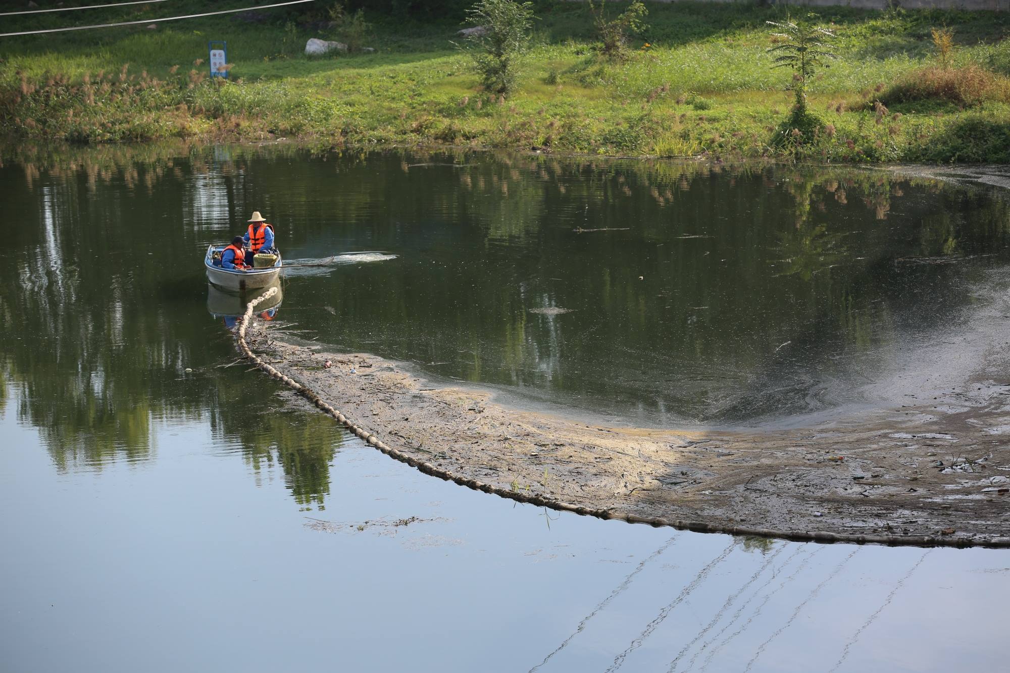 为守护好水域环境,金年汇卫集团平谷公司精心打磨作业工艺,结合泃河、洳河水域面积大,两岸芦苇丛生等特点,总结实践经验,改进打捞工艺,创新采用双层围网水面清漂工艺,通过冲锋舟与双层拦截网组合方式,高效地将水面上大小不一的各类漂浮物“一网打尽”。
